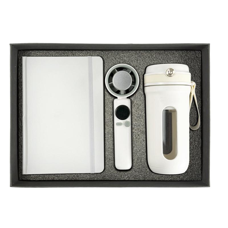 Upgrade your corporate gifting with our Premium Gift Set Box, featuring a stylish notebook, a portable juice blender, and a high-performance fan perfect for daily use. Personalize each item with your brand logo for a professional touch.