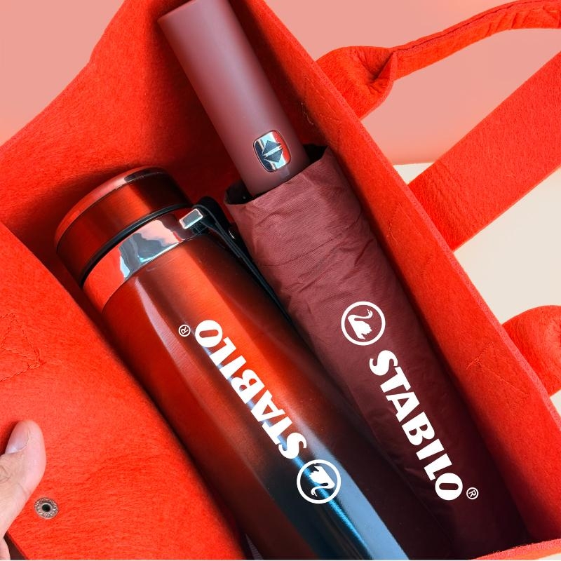 Default price includes 1 colour printing on all items: Umbrella, Flask, box(Limited to specific size and area)/ canvas bag/ felt bag